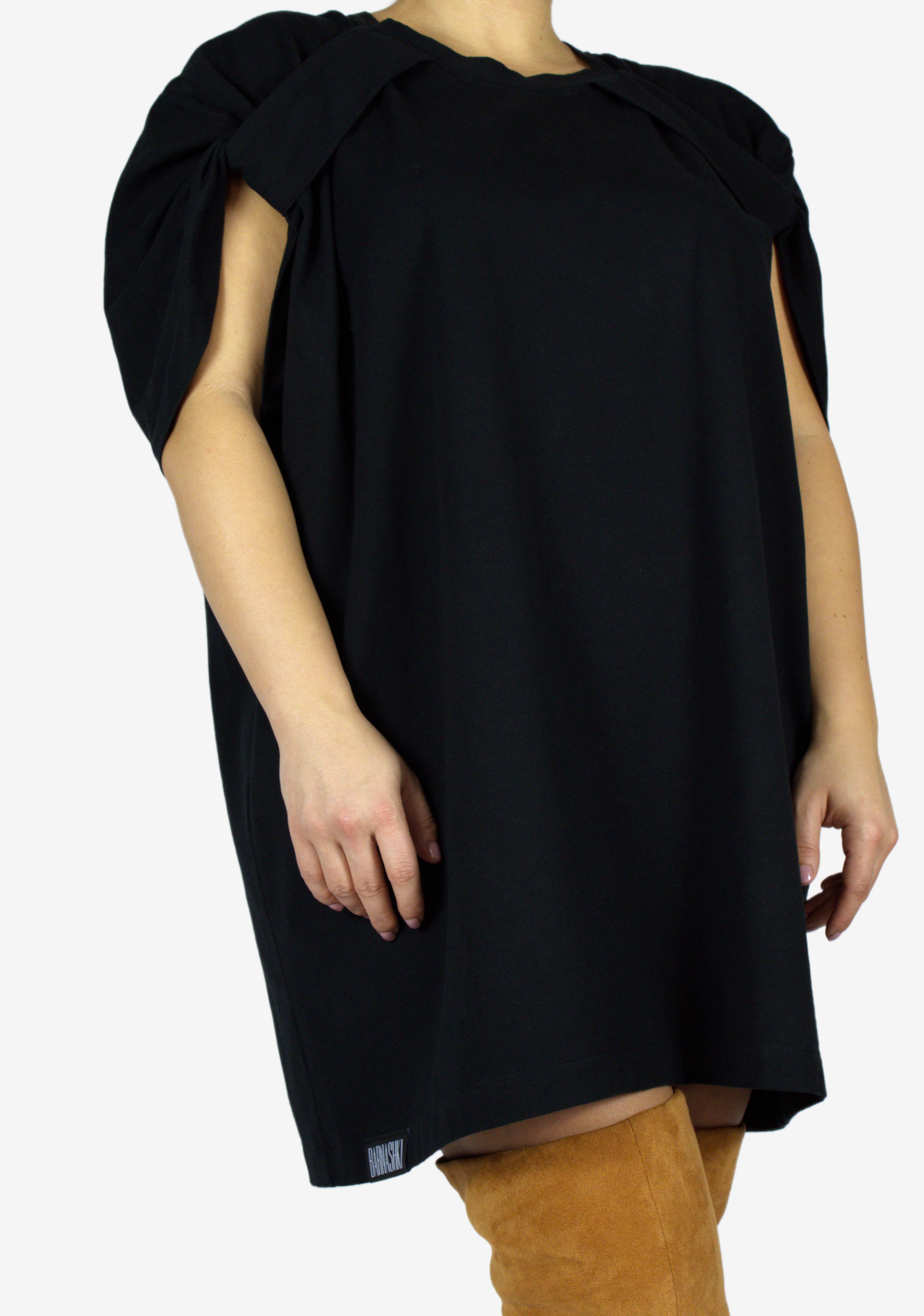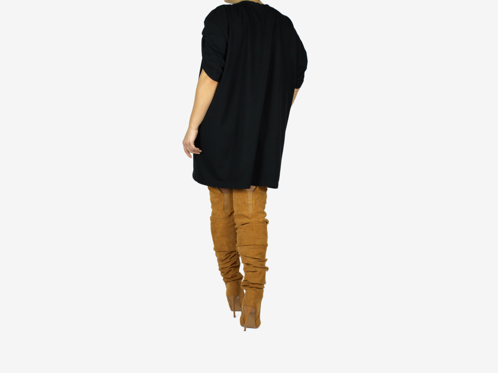 Štýlové a maximálne pohodlné! Tieto čierne oversized tričkové šaty sú must-have kúskom v šatníku. Sú vyrobené z bavlny a elastanu, vďaka čomu sú mäkké, priedušné a jemne elastické pre dokonalé pohodlie. Voľný strih s padnutými ramenami dodáva outfitu jedinečný dizajn.